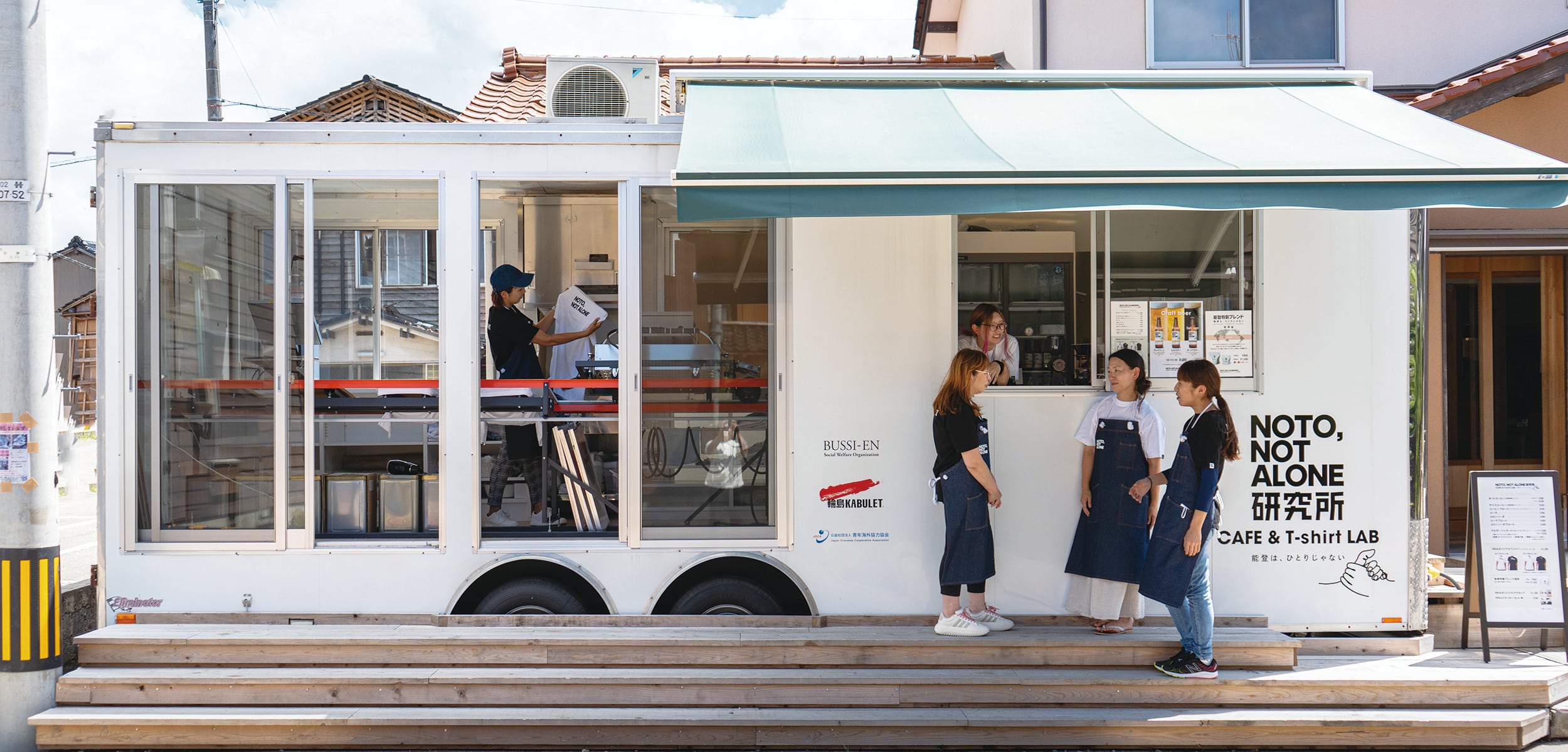 佛子園の能登の拠点「輪島KABULET」に設置したトレーラーハウスから、オリジナルのハンドメイドTシャツや、コーヒー、クラフトビールなどをお届けしています。